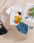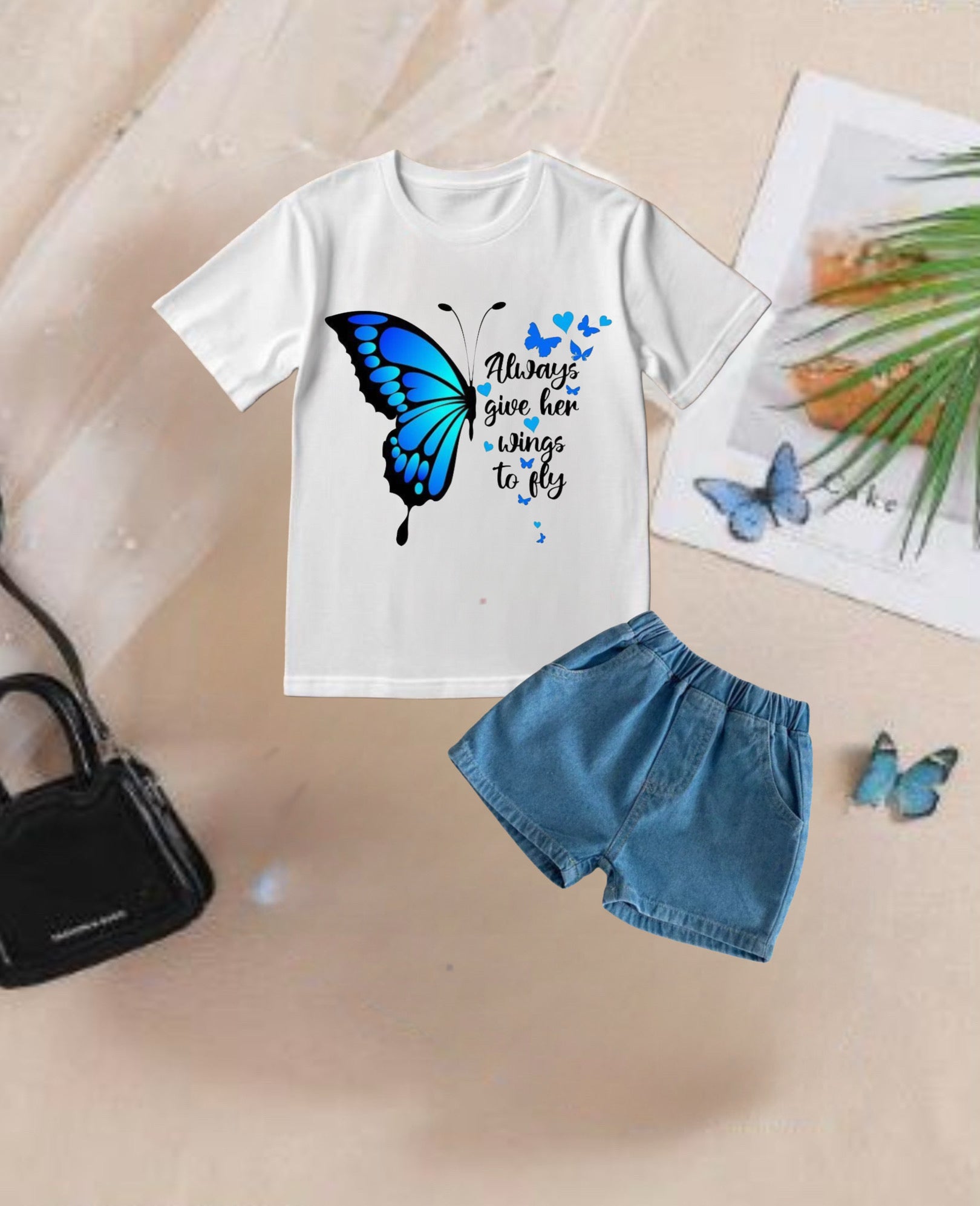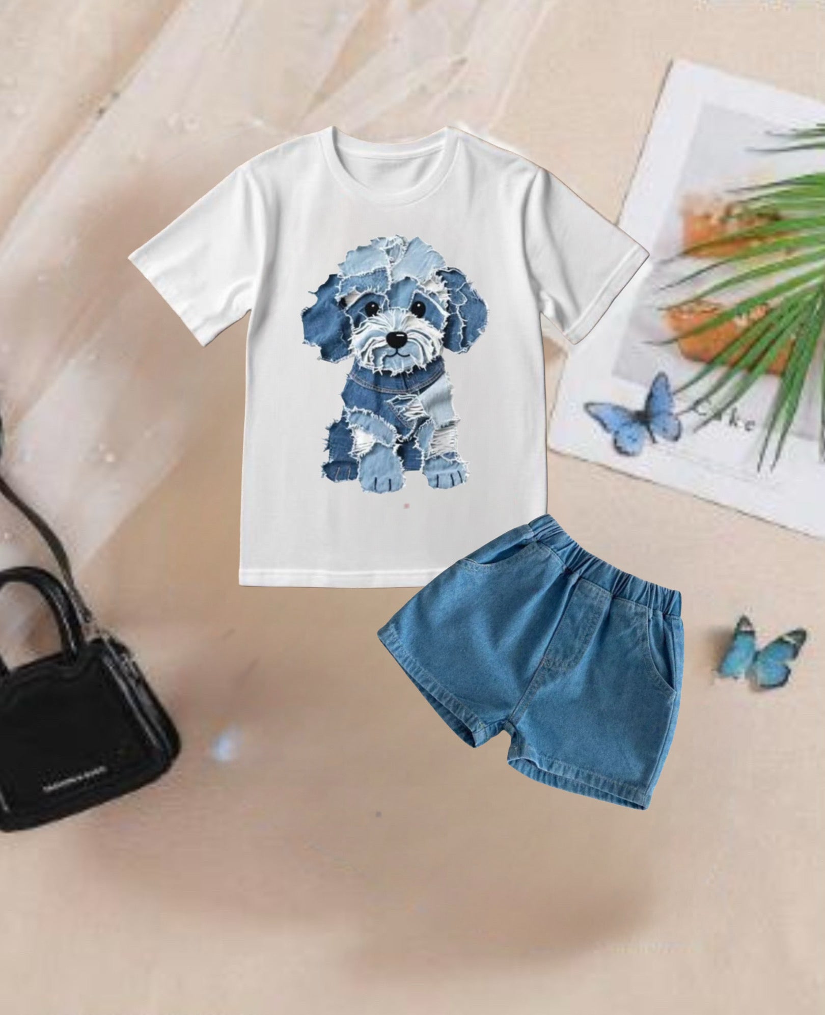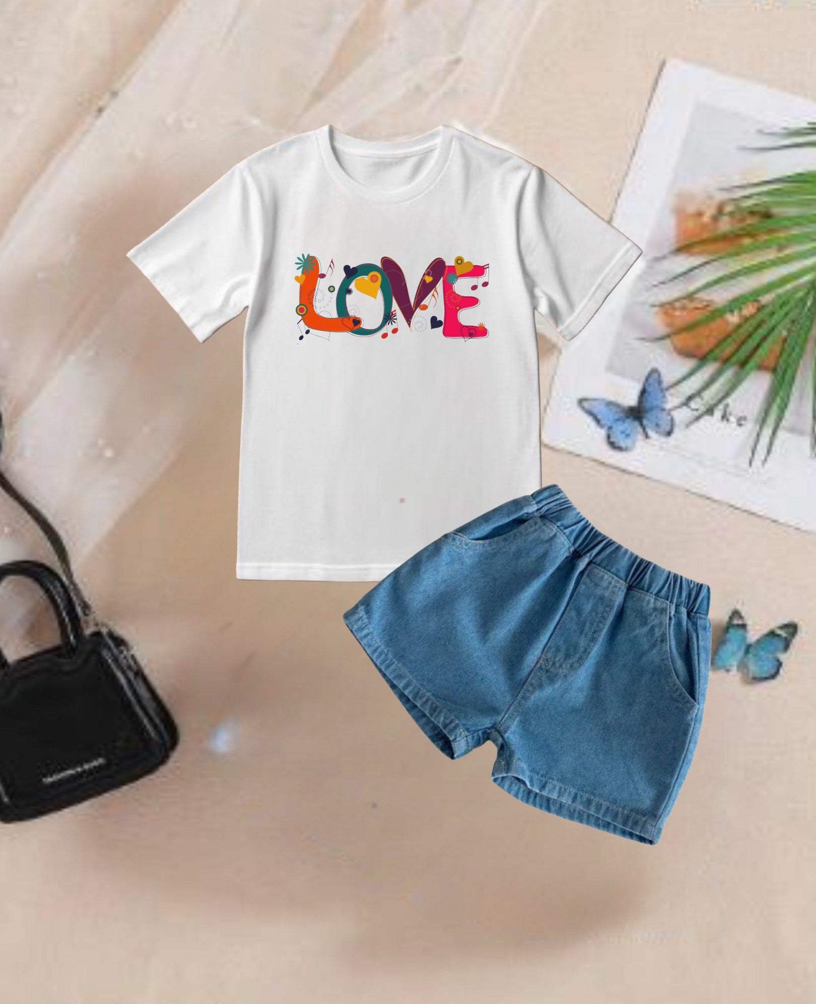Give her wardrobe a stylish upgrade with this girls’ T-shirt and denim shorts set. The soft cotton T-shirt features a cute print that adds a fun, playful touch, while the classic blue denim shorts offer a trendy and comfortable fit. Perfect for summer days, picnics, or casual outings — this outfit blends comfort, charm, and effortless style. Pair it with sneakers or sandals for the perfect cool-girl look!